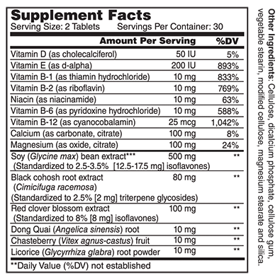 Menopause Support is a potent women’s formula for support during mid-life changes. It contains several standardized herbal extracts and nutrients such as black cohosh, soy, red clover, and B-complex which support hormone balance. Black cohosh, soy, and red clover contain several important ingredients, including triterpene glycosides (cimicifugoside) and isoflavones (formononetin). Formononetin is the active element in the herb that induces an estrogen-like activity in the body which can lower luteinizing hormone levels. This effect is extremely helpful for women going through menopause, suffering from hot flashes.